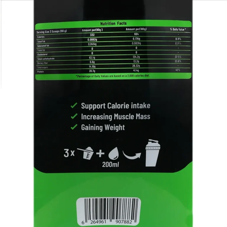 در هر ۳ پیمانه (۹۰ گرم) از این مس گینر، حدود ۶۲.۱ گرم کربوهیدرات، ۲۰.۷ گرم پروتئین و ۳۳۲ کیلوکالری انرژی وجود دارد که بهطور مؤثری ذخایر گلیکوژن عضلانی را تقویت میکند. این ویژگی به بهبود قدرت و استقامت حین تمرین کمک کرده و از افت انرژی جلوگیری میکند. وجود پروتئین کافی نیز از ساخت و ترمیم عضلات پشتیبانی کرده و ریکاوری پس از تمرین را تسریع میبخشد.